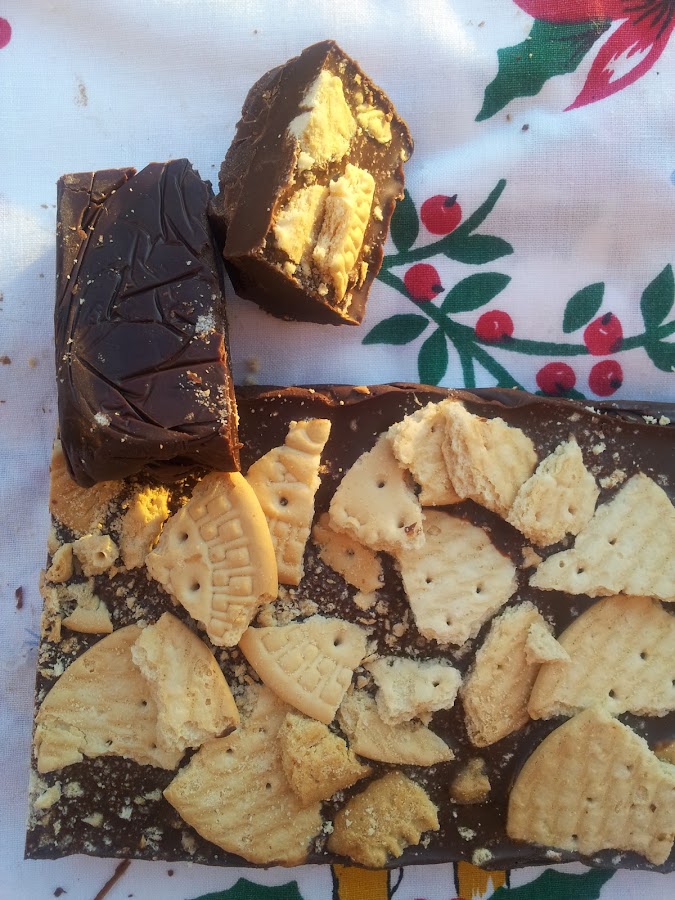 Cubrir con el chocolate hasta alcanzar el grosor de una tableta de turrón, que es alrededor de unos 1,5-2 cm. y remover para que se distribuya bien.