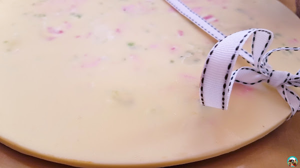 2.- Colocamos en un paño limpio las piruletas, las rompemos con la ayuda de un martillo pequeño o un mazo de cocina. Esparcimos los trozos de caramelos sobre el chocolate blanco. Guardamos en la nevera el turrón cubierto con papel flim hasta que se solidifique.