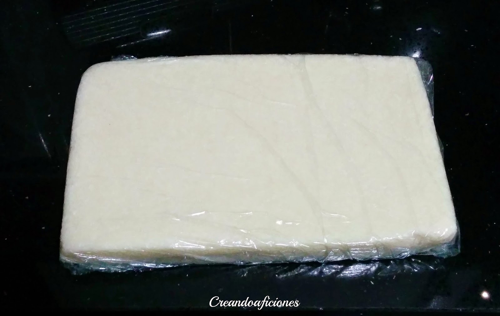 Amasamos bien hasta hacer una bola y con papel film prensamos bien hasta hacer la forma de una tableta de turrón, nos podemos ayudar de un rodillo y de un cuchillo grande para aplanar bien los bordes. Todo esto es sino tenéis un molde de turrón.
