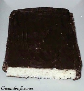 Lo metemos en la nevera y cuando este duro el chocolate, le damos la vuelta y volvemos a meter la otra mitad del chocolate en el microondas y extendemos la otra mitad que nos queda de la tableta de coco y ya tenemos nuestra tableta de turrón de chocolate y coco lista para comer.....bueno mejor meter otro rato mas en la nevera....habrá que esperar un poco mas....