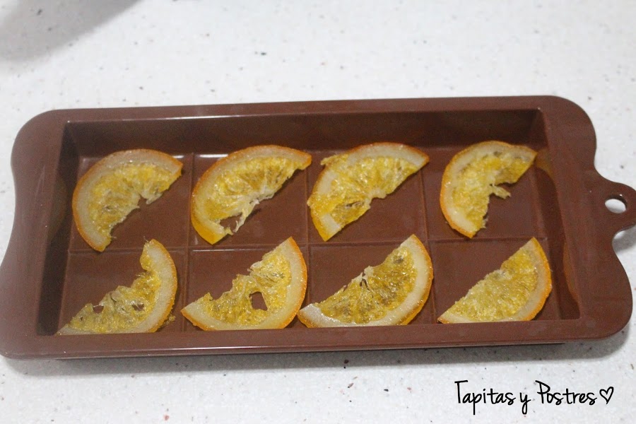 Cortamos las rodajas de naranja en dos y las ponemos en el molde de turrón. Yo tengo uno de silicona pero podéis fabricaros vuestros propio molde cortando un brick de cartón (de los de leche) por la mitad a lo largo. Lo lavamos bien y tendremos un molde casero perfecto.