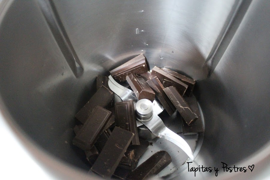 Nos ponemos con el chocolate negro, lo trituramos en la thermomix 5 segundos a velocidad 8 y reservamos.