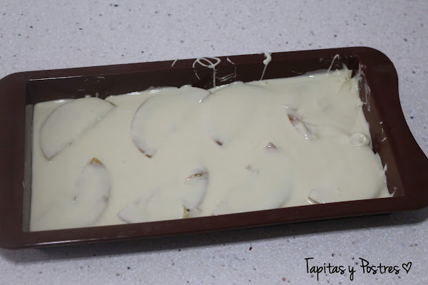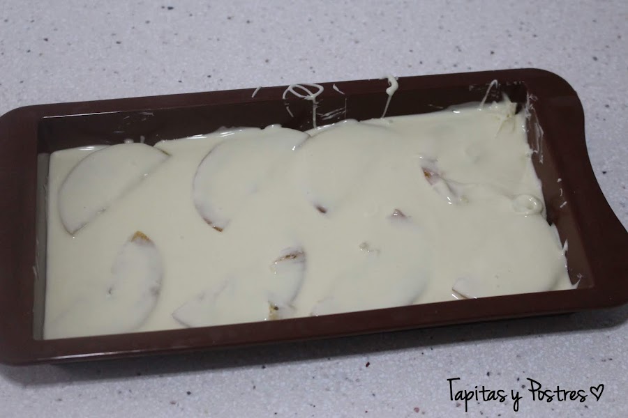 Y echamos el chocolate blanco fundido encima. Dejamos que cuaje, una media hora.