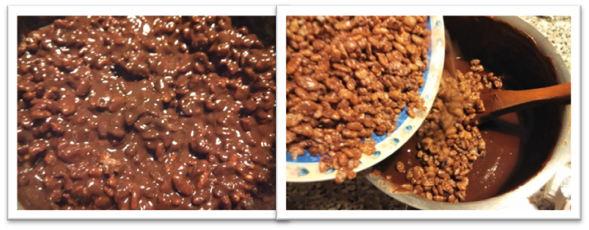 Lo primero que hay que hacer, es poner la mantequilla a derretir al baño María. Una vez derretida, se añaden los chocolates, y se remueve sin parar hasta que la mezcla esté homogénea, brillante y suave. En este momento apartamos el cazo a un lado, fuera del baño María, y añadimos todos los cerelas.
