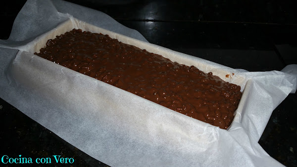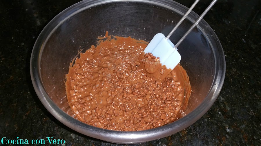 3/ Pasamos la mezcla de chocolate a un bol con ayuda de una espátula de silicona para ayudarnos y añadimos el arroz inflado.