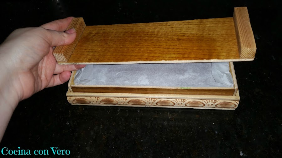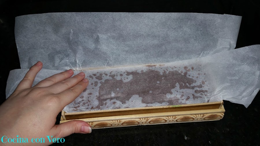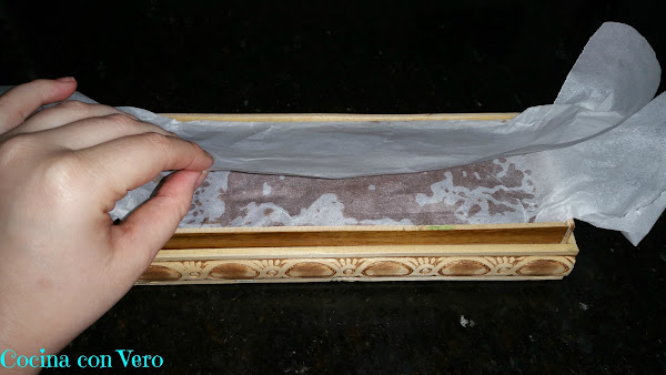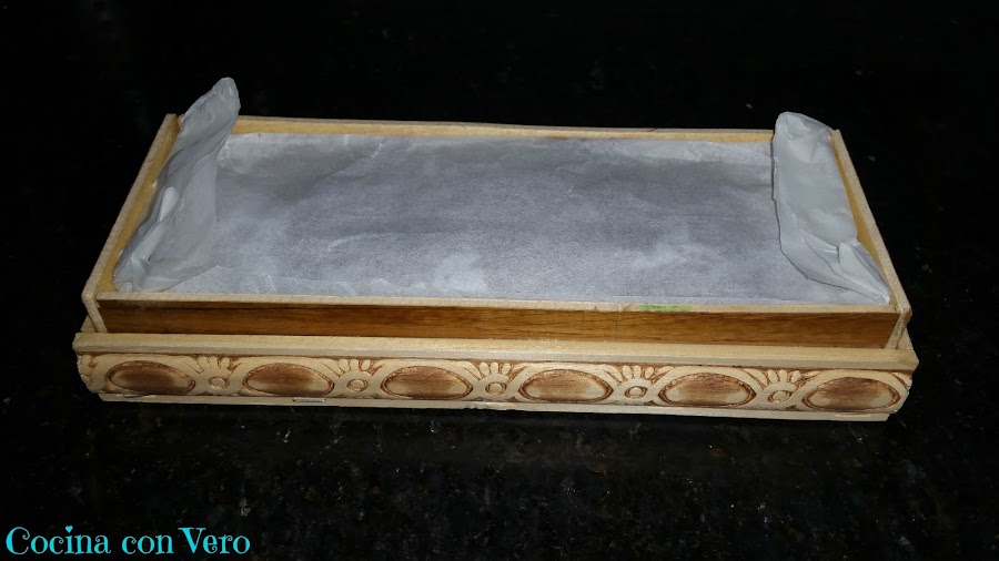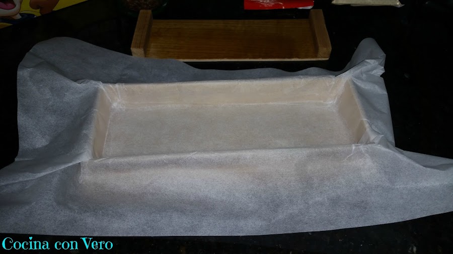 2/ Forramos un molde para turrón con papel vegetal de manera que nos sobre por los lados para que después podamos taparlo.