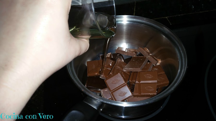 1/ Partimos el chocolate en trozos y lo ponemos en un cazo a fundir a temperatura media/baja, añadimos el aceite y mezclamos bien con la varilla de mano.