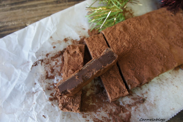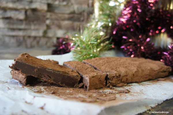 Recuerda este turrón a las trufas o a los brownies por su interior húmedo y tierno, recubierto de una capita fina pero crujiente de chocolate negro. El chocolate de la cobertura no es para cubrirlo entero, por eso os puede resultar que es poca cantidad, es para pincelar un poco y hacerle unos surcos de adorno. En mis fotos no se aprecia bien esto, pero, al natural os digo yo que queda de lo más chulo.