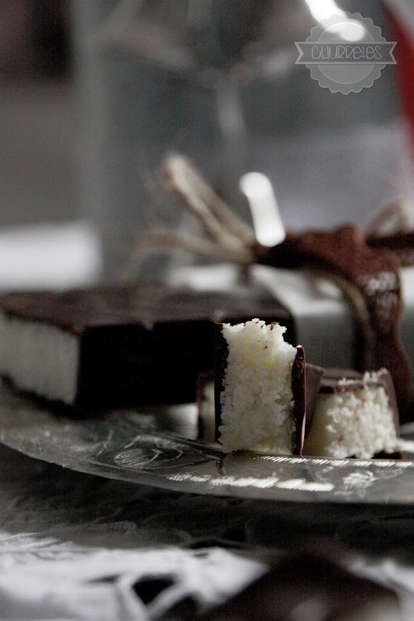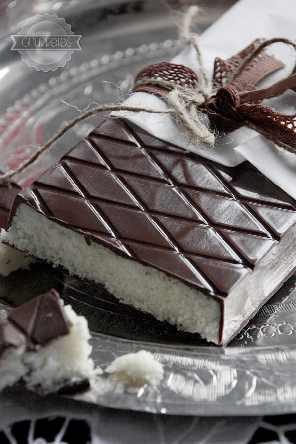 Introducir en el frigorífico hasta que se solidifique, rellenar con la mezcla de coco presionando un poco y reservar en el frigorífico unas horas. Cubrir con cocholate derretido (el que nos sobró) y esperar a que se solidifique antes de desmoldar.