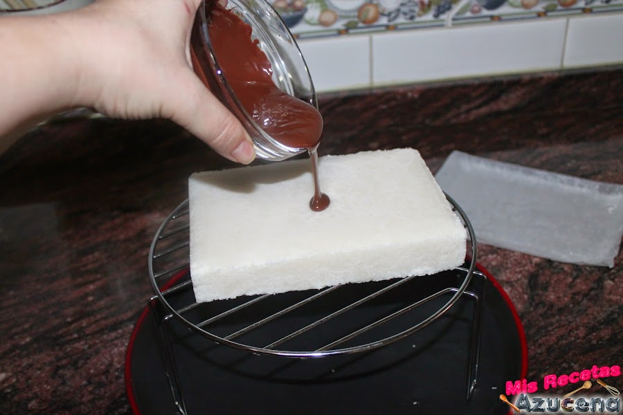 Una vez tengamos el chocolate derretido sacaremos nuestro molde de la nevera, le pasaremos la punta del cuchillo por los lados para poder desmoldarlo mejor y una vez lo tengamos desmoldado lo pondremos sobre una rejilla para poder cubrirlo con el chocolate por todas partes, una vez tengamos el chocolate bien repartido lo dejaremos hasta que el chocolate se endurezca esto será sobre unas 2 horas.