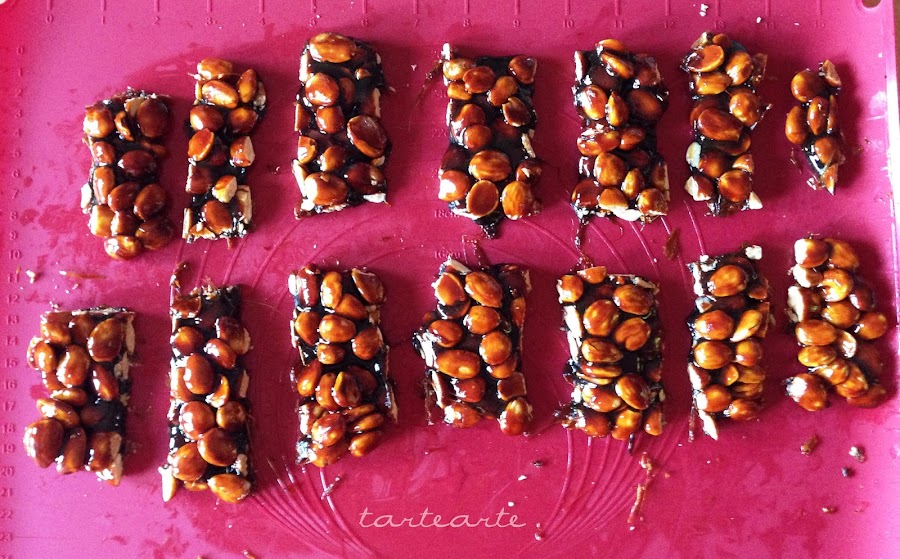 Para cortarlo y ya tener los trocitos de guirlache, es mejor cuando este todavía caliente. Le dejamos unos minutos para que no nos quememos los dedos y lo cortamos con el cuchillo.