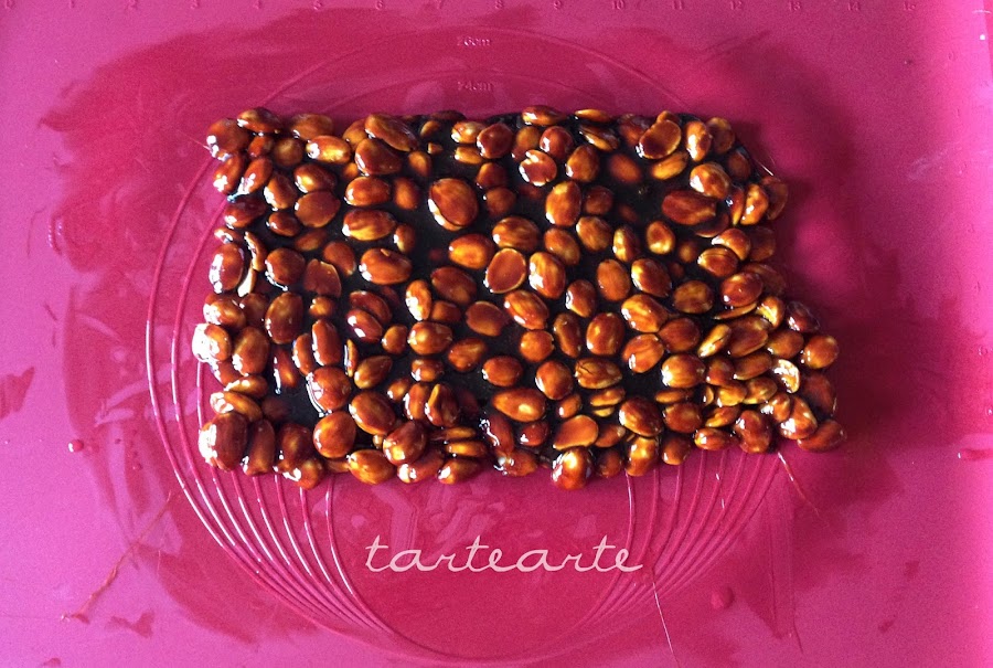 Cuando el caramelo llegue a 175º- 180º añadimos las almendras, la removemos rápidamente con la cuchara de madera y lo extendemos en nuestro molde/silpat/silicona y lo aplanamos con la ayuda de la cuchara o la lengua.