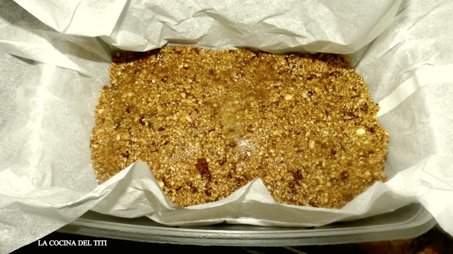 6º Pondremos en un molde rectangular con papel de horno, tapamos y metemos en el frio. Dejandolo unas 12 horas para que coja consistencia.