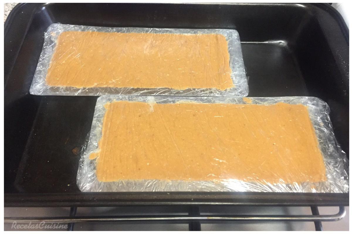 5. Tapamos bien con film y dejamos sobre una bandeja o recipiente para que recoja el aceite que irá soltando. Yo he puesto las dos tabletas en una bandeja de horno. Colocamos un peso encima, como puede ser un brik de leche para que ayude a prensarse y a que las almendras suelten el aceite. Dejamos reposar fuera de la nevera, en un lugar fresco durante al menos 7 días, cuando más tiempo repose antes de servirlo, mejor estará, pero si no tenéis paciencia o tiempo, podéis probarlo antes. Yo una de las tabletas la he partido al quinto día, y la otra la dejaré hasta Nochebuena reposando.