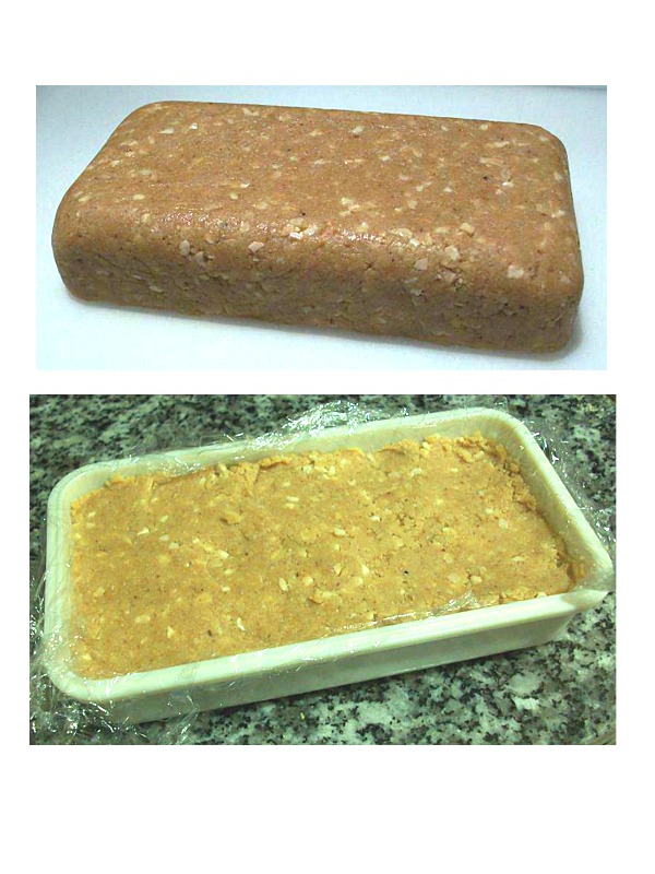 Forramos un molde (yo fiambrera) con film y echamos la masa apretándola para que quede compacta y ya está. Sale muy bueno...!!!