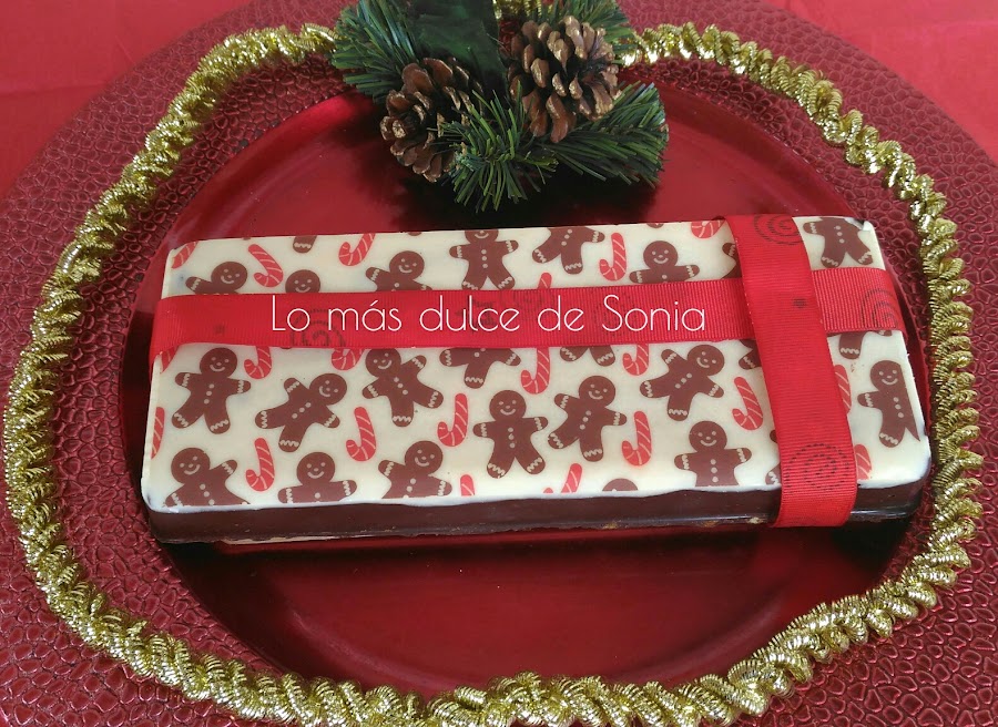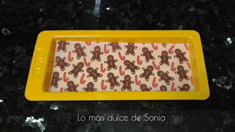 Me apetecía decorarla con ScrapCooking. Lo único que hay que hacer es cortar la lámina a la medida del molde y colocarla en la base, con la parte de colores vivos hacia nosotros. Para que se viera bien el dibujo, derretí un poco de chocolate blanco y cubrí la lámina de papel, una capa súper finita. Esto es opcional!!