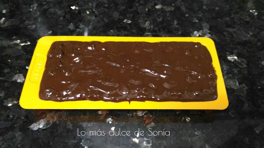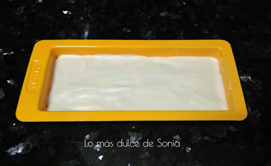 Lo única que hay que hacer es verter la mezcla en nuestro molde de turrón, daremos unos golpecitos para que quede bien distribuida la mezcla y dejaremos enfriar a temperatura ambiente o en el frigorífico.