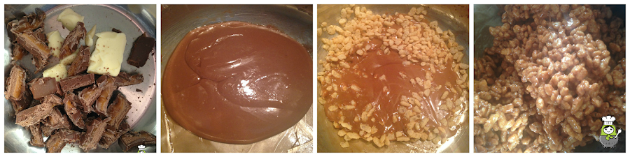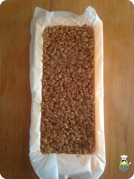 Agregamos los krispies a la mezcla de chocolate y removemos enérgicamente y muy rápido hasta mezclar bien todo el arroz inflado con el chocolate fundido. Inmediatamente y antes de que se enfríe, colocamos la mezcla en nuestros moldes de turrón, previamente forrados con papel sulfurizado. Si no tenéis moldes de turrón, también os vale el fondo de un molde clásico de cake. Presionamos bien el arroz con ayuda de una cuchara para evitar que quede ningún hueco vacío e intentando nivelar toda la tableta. La única dificultad es realizar toda la operación lo más rápido posible, porque en cuanto se enfría el chocolate y se endurece el caramelo que contienen los Mars, la mezcla deja de ser manejable.