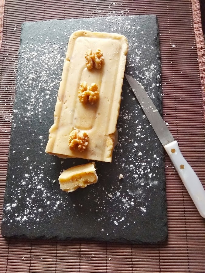 Es un cuadro con colores muy suaves, en el que las figuras protagonistas, la virgen María, San José y el niño, se pierden en el entorno nevado. Que sería una receta navideña lo tenía claro, pero los colores, me hicieron pensar en este turrón de nata (crema de leche) y nueces, que a mí siempre me ha gustado mucho y tenía muchas ganas de hacerlo.
