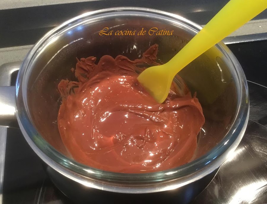Retiramos el film y lo desmoldamos, derretimos una barrita de chocolate al baño maría. mojamos la base de las nueces reservadas y decoramos el turrón.
