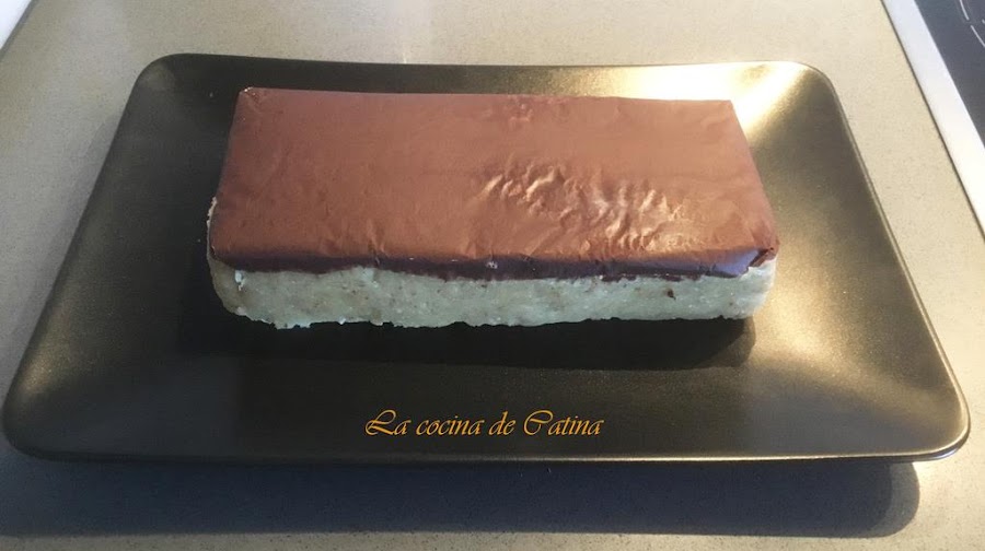 Lo vertemos en un molde rectangular de paredes bajas y lo dejamos enfriar. (Si no tenéis molde, podéis utilizar el envase de un tetrabric de leche, debidamente recortado).