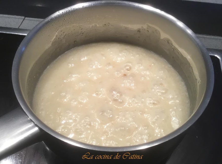 Ponemos la nata (crema de leche) con el azúcar glass en un cazo y la llevamos a ebullición, bajamos el fuego y cocemos durante 5 minutos removiendo hasta obtener un jarabe espeso.