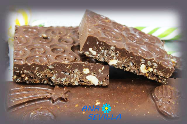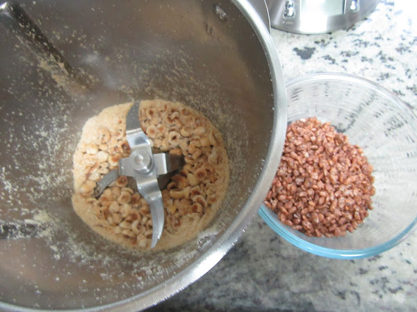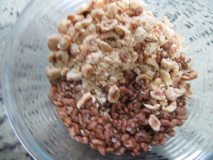 3- Agregar 50 gr. de arroz inflado y las avellanas y mezclar, 10 seg. , giro izda, vel. 2. Volcar en moldes, dar unos golpecitos contra la meseta para que no queden burbujas de aire y dejar endurecer.