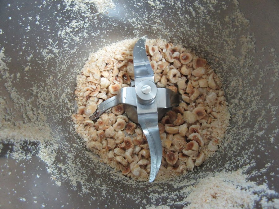 1- Trocear las avellanas unos 4-6 seg. vel.4. Que queden trozos un poco gruesos. Reservar.