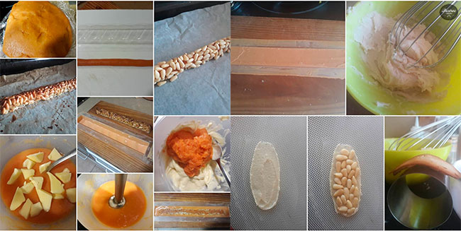 125 gr de boniato asado, 125 gr de almendra molida, 70 gr de azúcar glas, ralladura de 1 limón, 1 huevo batido para pintar y piñones.