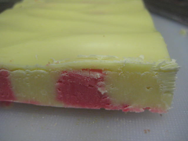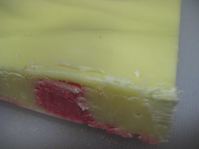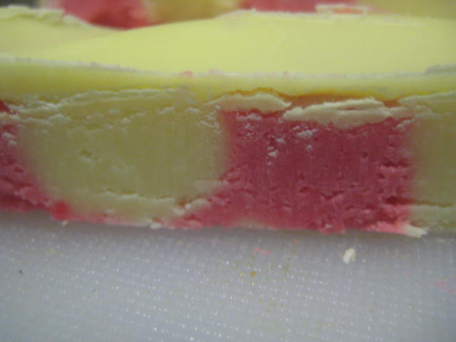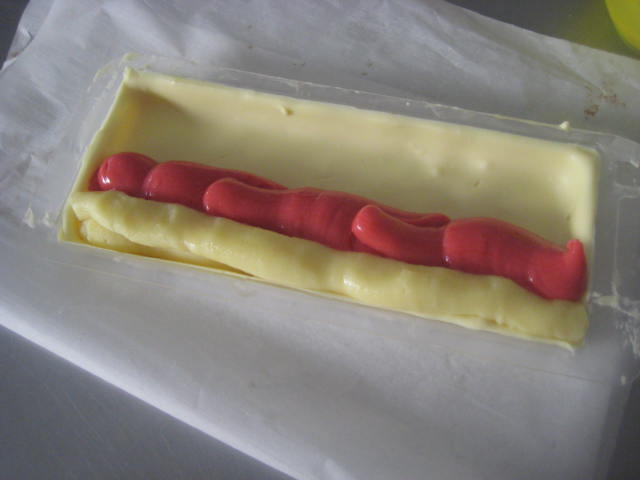 Cuando ya tengamos las dos cremas puestas en manga ir colocándolas en el molde en forma de listas, alternando las dos. Dejar reposar en frío para que fragüe y ya podremos, si lo deseamos, cerrar con cobertura negra. Se puede hace igualmente en transfer