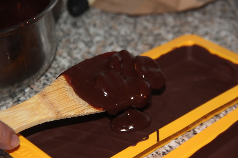Reservamos durante un par de horas hasta que la trufa tome textura. Transcurrido ese tiempo volvemos a fundir el chocolate de cobertura que nos había sobrado de forrar nuestros moldes y vertemos sobre el turrón para hacer la capa base.