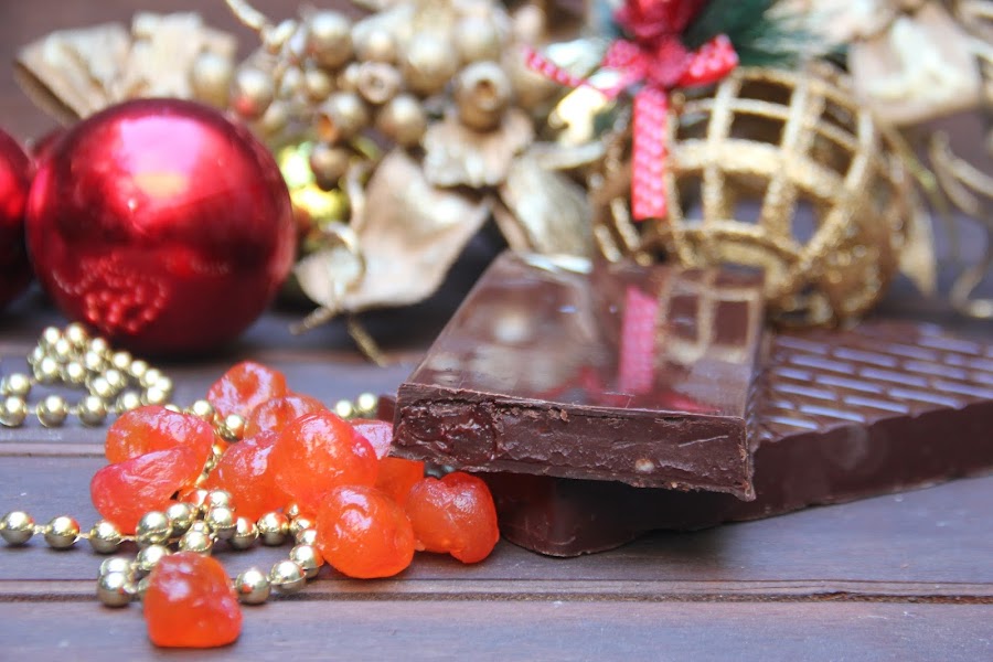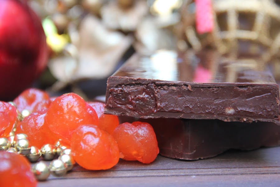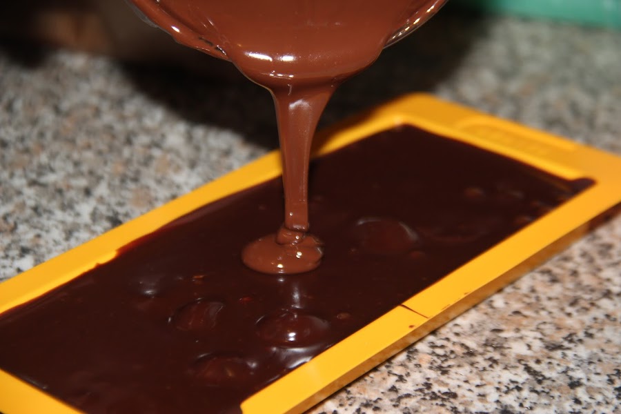 Fundimos 100 gramos de chocolate de cobertura. Vertemos el chocolate sobre nuestro moldes (en el fondo y también en las paredes. Reservamos el sobrante que usaremos después). Mientras esperamos a que solidifique, preparamos el relleno. Para ello fundimos los 150 gramos de chocolate negro que nos quedaban, el chocolate con leche, la nata (crema de leche) y el azúcar glass. Cuando esté bien integrado añadimos las cerezas y rellenamos nuestros moldes.