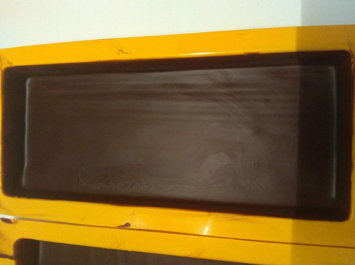 1. Equipamos el robot con la cuchilla amasar/picar. Ponemos en el bol el chocolate fondant en trozos y programamos velocidad 3, 55º, 5 minutos. Según la temperatura inicial del chocolate, podría necesitar más tiempo. Con este chocolate cubrimos por la base y los lados, dos moldes de turrón o dos briks de leche cortados a la mitad. Reservamos los que nos sobre, para tapar la tableta.