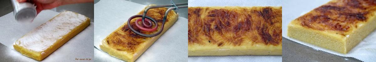 Colocar la tableta sobre la superficie de trabajo y extender por toda la parte superior la yema pastelera, alisando con una espátula. Añadir una capa de azúcar glass. Conectar el quemador. Dar una primera pasada apoyándolo con suavidad sobre el azúcar y la yema.