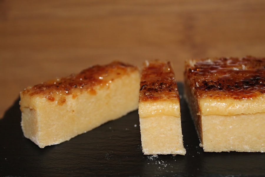 Espolvoreamos la tableta de turrón con azúcar glace y quemamos con la ayuda de un soplete. Damos la vuelta al turrón y mojamos en la yema, alisando la superficie con una espátula.