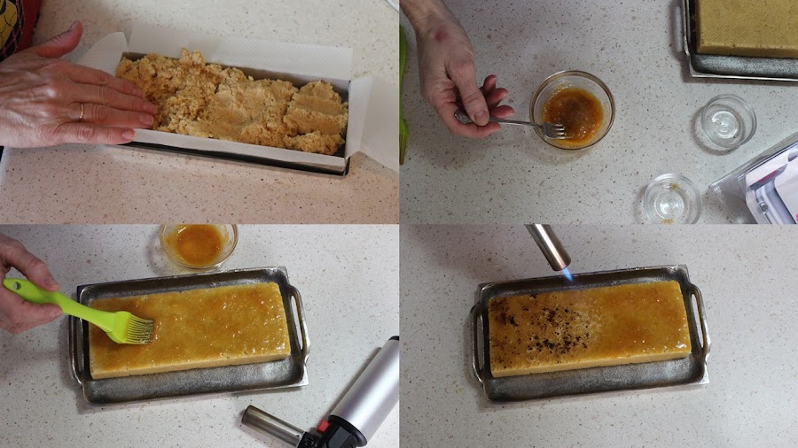 Una vez pasado el tiempo de reposo lo desmoldamos y batimos una yema con una cucharada de azúcar moreno y la extendemos por encima. Lo gratinamos en el horno hasta que esté dorado o lo quemamos con un soplete.