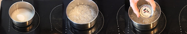 En un cazo ponemos el agua y el azúcar y lo dejamos hervir a fuego medio hasta que se forme un almíbar de hebra fuerte, tiene que alcanzar los 110ºC. Serán más o menos 4-5 minutos hirviendo.