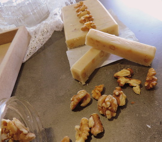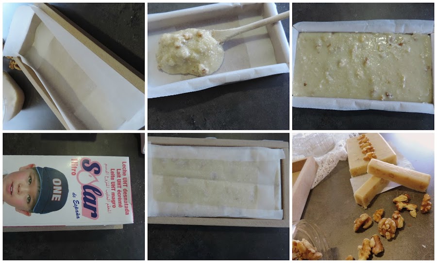 Este año abrimos con un Turrón de nata (crema de leche) nueces que tenía yo ganas de probar,mira que no soy yo muy de turrones,pero todos los años caen un par por lo menos.Y es que no tiene nada ver un turrón casero con uno comercial.