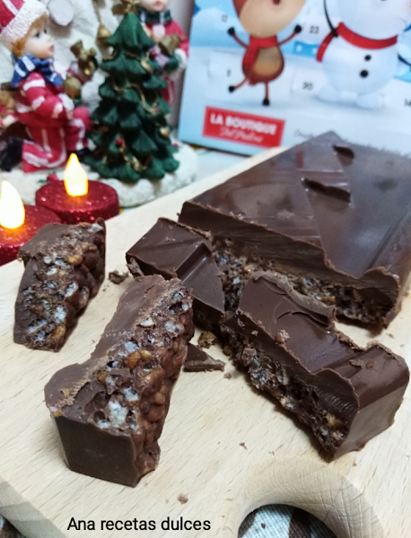 Troceamos los chocolates y los ponemos junto con la manteca de cerdo en un bol hondo al baño maría, removemos hasta que estén completamente fundidos.Apartamos del fuego y añadimos el arroz inflado, mezclamos muy bien hasta integrarlo.