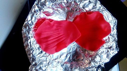 Comienza poniendo los pétalos. Primero 2 mirándose uno a otro, y luego los otros dos... Esta es una copa a la cual le he puesto papel de aluminio. Pincela con un poco de maicena donde vas a colocar la flor, para que el fondant no se pegue al papel.