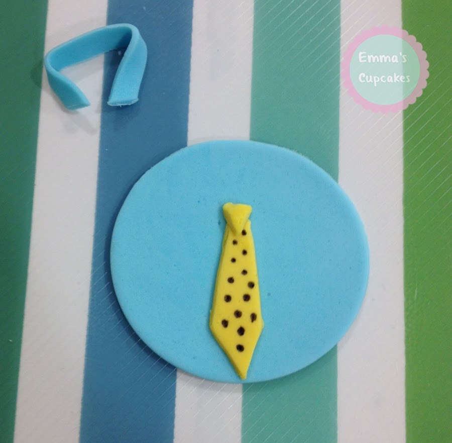 Cuando ya tengamos nuestra corbata pintada, juntaremos las partes de la camisa y las "pegaremos" con un pincel y un poquito de agua: el cuello, corbata y bolsillo. ¡Ya tenemos nuestra decoración de camisa con fondant lista!