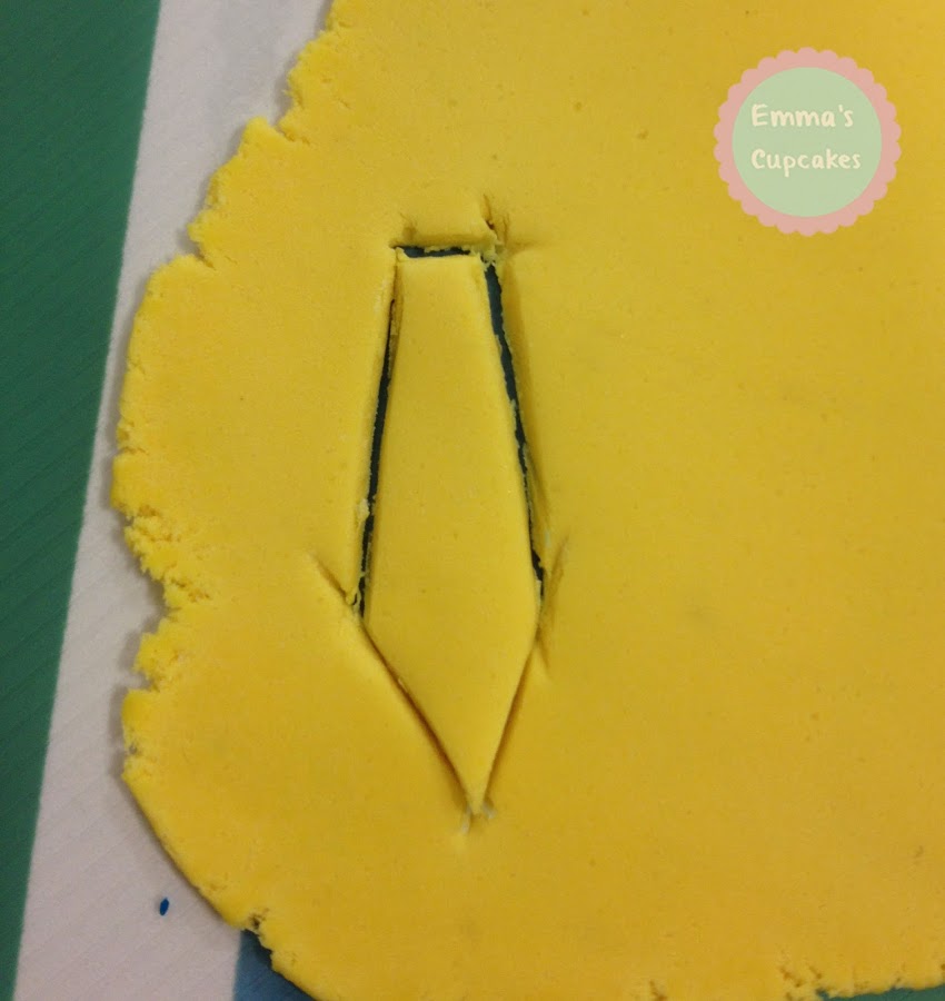Seguidamente, escogeremos otro color de fondant para hacer la corbata y cortaremos con la esteca de corte la forma de una corbata.