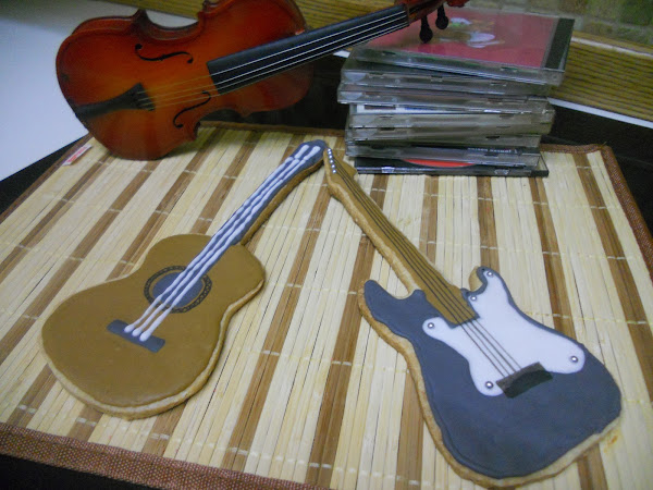 5º " Les damos la formas que queramos. Por ejemplo las guitarras, como no hay moldes las hicimos con unos recortes de guitarra, son un poco más laboriosas pero el resultado a veces es lo que cuenta. Las otras son mucho más fáciles ya que simplemente es coger los moldes y darles presión contra la masa extendida e ir haciendo galletas.