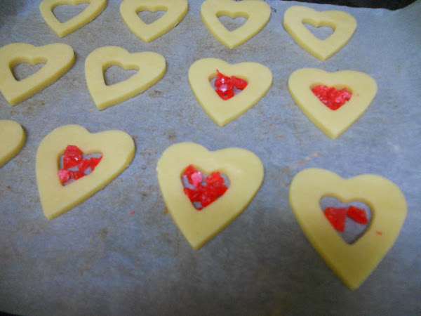 1º " En un mortero romperemos unas piruletas de caramelo del color que más os guste, antes de poner las galletas en el horno, le colocamos en el interior unos trocitos del caramelo y seguimos haciéndolas normalmente siguiendo los pasos anteriormente descritos para las otras galletas.