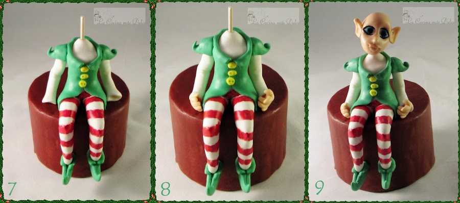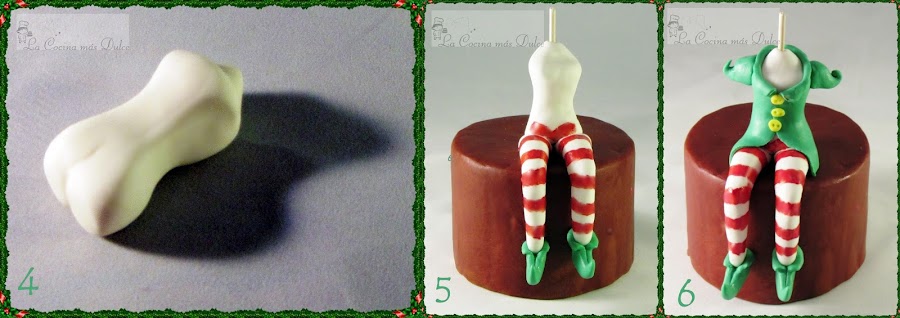 Imagen 3: Este paso es muy sencillo sólo tenemos que pegar las botas a las piernas. Como sabréis existen pegamentos alimenticios, pero a mi me gusta pegar directamente con agua (natural y barato). La parte negativa del agua es que derrite el fondant y si nos pasamos con la cantidad no sólo se pondrá pringoso, sino que además puede que el verde de las botas nos destiña y nos manche los pantalones blancos. Así que ponemos poquito con un pincel. Llegados a este punto yo le pinte unas rallas rojas a los pantalones y las deje secar. Para los que les resulte complicado pintar sobre fondant se pueden dejar los pantalones blancos (que también queda bien) o hacer las rayas con tiritas de fondant rojas (pero hay mas posibilidades de que nos destiña).