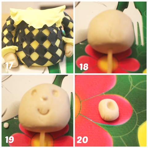 19- Con la esteca de bolillo pequeña hacemos las cuencas de los ojos (después rellenamos con fondant blanco y ponemos una bolita muy muy pequeña de negro). Haremos una bolita color carne que será la nariz. Y le marcamos una sonrisa.
