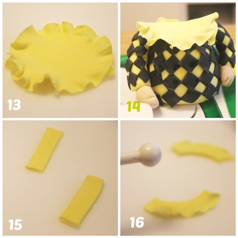 15- Cortamos dos tiras de fondant amarillo estirado fino.