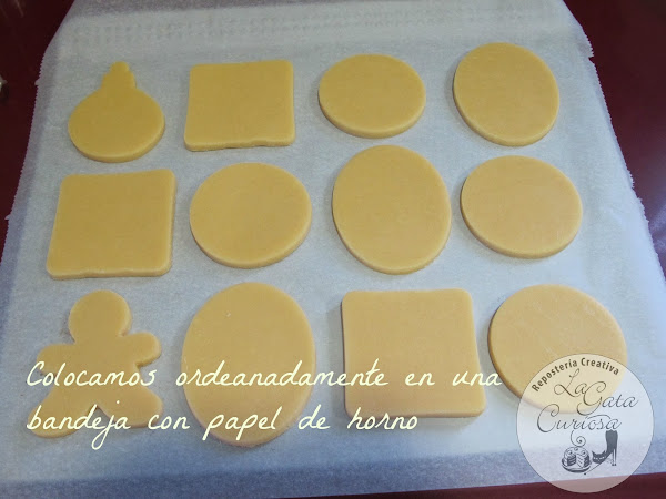 Una vez que la masa esté reposada y fría cortamos nuestras galletas y las colocamos en una bandeja de horno con una separación entre ellas porque al cocer se hinchan un poco. Una vez que las tengamos todas cortadas nos quedarán los recortes de masa que volveremos a unir, estirar, enfriar un rato y a cortar de nuevo.