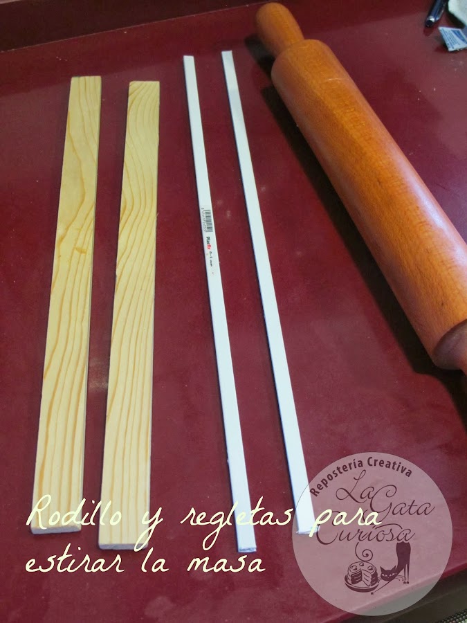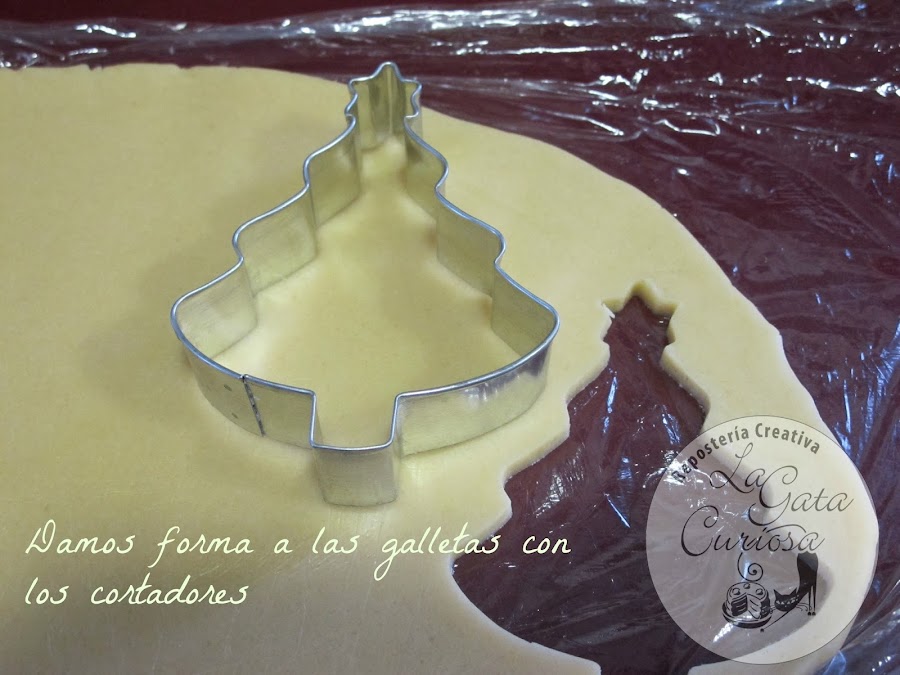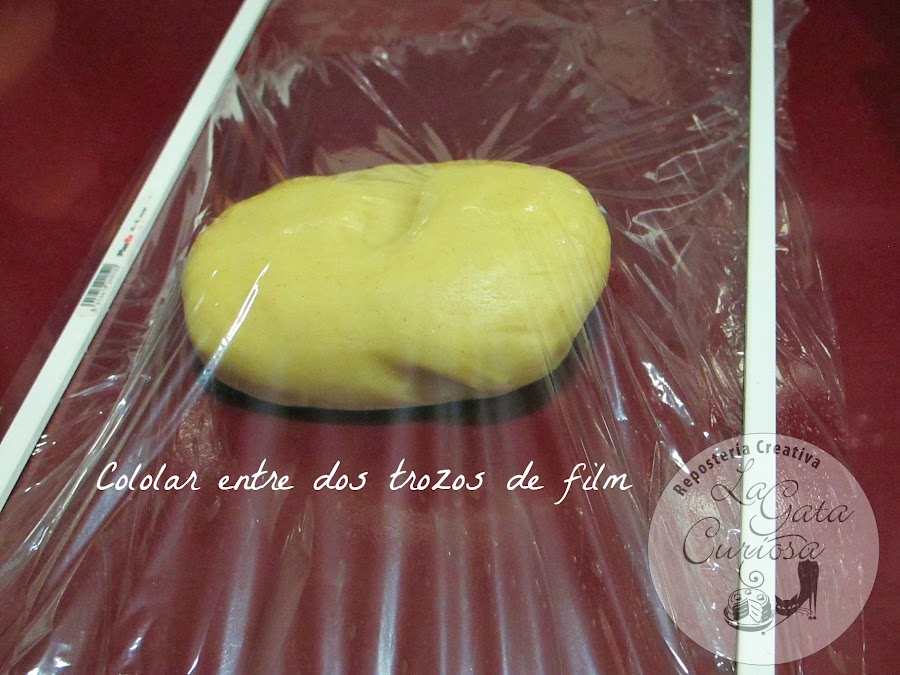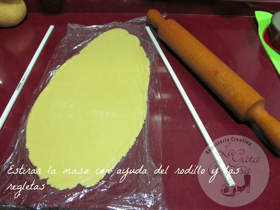 Dividimos la masa en dos o tres partes, colocamos un trozo de papel film sobre la superficie de trabajo y encima ponemos una parte de masa, cubrimos con otro film y con la ayuda de dos regletas de madera o de plástico del mismo tamaño la estiramos con el rodillo (el grosor de las galletas puede ir desde los 5 mm a los 7 mm, dependiendo un poco del gusto de cada uno, a mi personalmente me gustan de 5mm para todo, y las de 7 mm cuando hay que ponerles un palito para que queden como una piruleta).