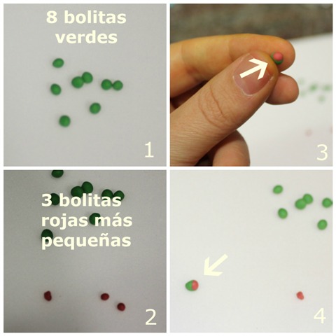 Con la pasta de color verde haremos 8 bolitas de unos 3mm de diámetro.